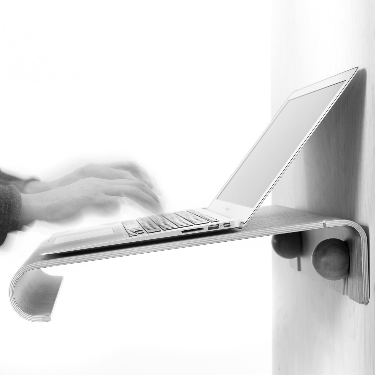 I modsætning til traditionelle skriveborde er MacBook Wall Desk designet til fleksibilitet. Det monteres på væggen med to træknopper (medfølger) og kan løftes af med en simpel bevægelse. Let og nem at bære, giver det dig friheden til at ændre din arbejdsplads, efterhånden som din dag ændrer sig.
